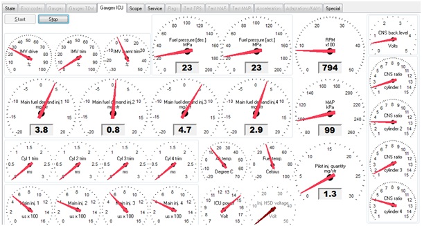 Rozhodol som sa vymenit repasovany vstrekovac za povodny. Demontoval som repasovany, zalozil povodny, nakodoval a nastartoval. Nepravidelny chod zmyzol, v celom spektre otacok. Namerane hodnoty v diagnostike vyzerali takto: