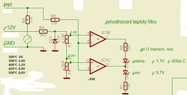 Joni píše:Jde to i jednodušeji, ale má to nevýhody. Totiž, když použijeme starý ručkový indikátor ze starého magnetofonu spolu s trimrem (asi 22K - 47K) v sérii, tak jej lze nastavit tak, že bude ukazovat plný rozsah cca 4V. Pak si na stupnici poznamenat hodnoty 200, 300,.. atd. až třeba 600°C a bude nám ukazovat přímo teplotu. Jediná nevýhoda je v tom, že v provozu si nastartované regenerace nevšimneme. To rozsvícená LED dá o sobě vědět lépe.