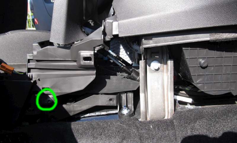 6. zatahneme rucni brzdu a nadzvedneme stredovy tunel; pod tunelem je jednotka airbagu, dozadu vedou draty pro konektor u rucky, uprostred jsou konektory USB/AUX/zasuvka a zlute je oznacen konektor (predpriprava!) pro osvetleni drzaku napoju v loketce a pro zasuvku pro cestujici na zadnim sedadle