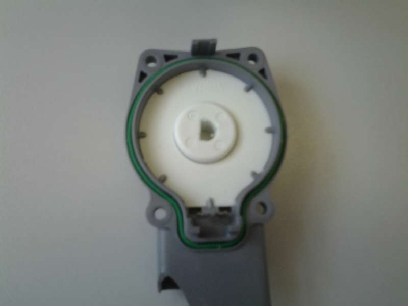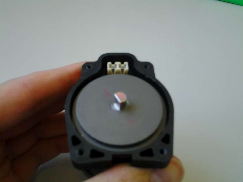 Motorek je zapouzdreny v plastu a neda se vyndat. Asi by to rozdelat slo ale destruktivne. Jeho hridel je zalisovany do nejake vymezovaci podlozky, ktera je ale dost bytelna. Pri provozu se otaci v rozmezi maximalne 10-80° coz je vymezeno konstrukcnimi dorazy a odpovida to priblizne poloham polu magnetu uvnitr (4poly na 360°). Je pouze jednociny a jeho zpetny chod je vyvozen vratnou pruzinkou.