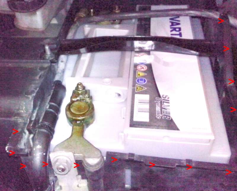 Nejdřív jsem sundal kryt vzduchového filtru ,potom jsem odpojil ty dva kabely co vedou na svorku k +pólu ,sundal svorku na baterii na +pólu,odšrouboval držák baterie,vycvakl přední čelo kaslíku a baterii kousek povytáhl, abych povolil svorku na -pólu.Potom už nebrání nic k úplnému vytažení baterie .Mám tedy starší model,ale postup by měl být cirka stejný.Po výměně baterie to bude chtít asi kód rádia.Nepamatuju přesně jak dlouho výměna trvá,ale nejpracnější je sundat kryt filtru.