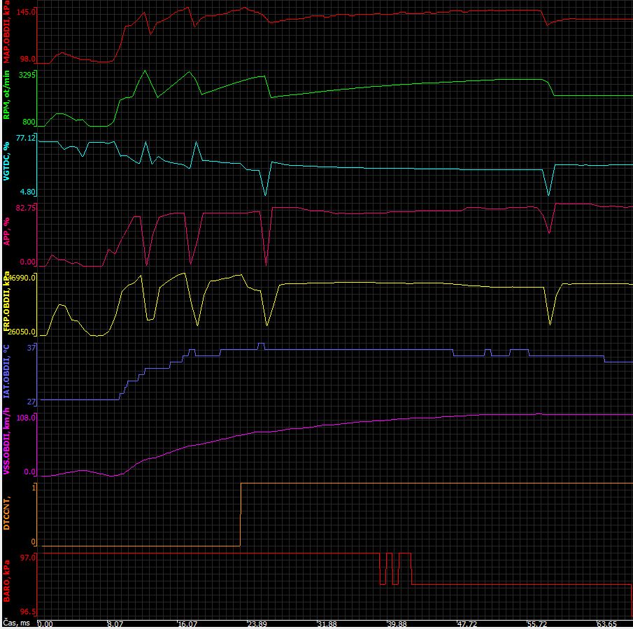 Tlak je 246990 :palec_nahoru: Právě ty data VGTDC by mě zajímali nejvíce.. Jak je to, když je VGTDC 100% tak turbo plní na 100% ?? EGR je nový cca 3 týdny a v servise to i naučili v jednotce. Klapku obtoku chladícího vzduchu jsem resetoval včera a dneska jsem nepocítil změnu. Váhu vzduchu jsem venku neměl - zkusím se na ni podívat. Jak mam to turbo zablokovat v dolní poloze? Předpokladam že následnou zkoušku musím zkusit za jízdy abych měl max. zátěž co? :D