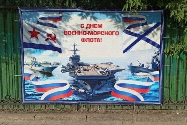 Jak rusák má plnou hubu keců a dal na propagandistickej plakát americkou letadlovou loď a ne svoji jedinou