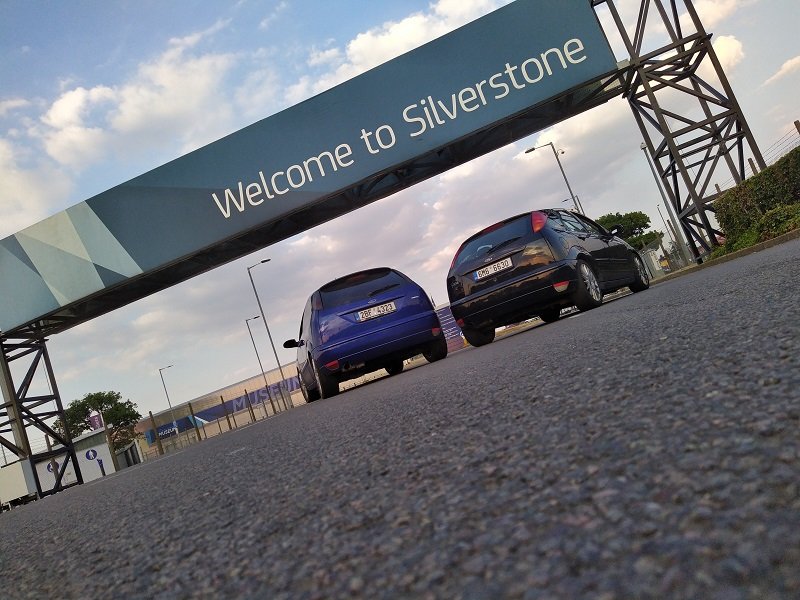 Stojíme v řadě a čekáme až jízda před námi skončí - mezitím přijel za nás nádherný červený Escort "kostička" celý vyrámovaný a vykuchaný. Hned jsme vylezli se na to podívat. Před ním stál ještě jeho syn - bílá stará hranatá Fiesta - motor z ST170tky....S majitelem Escortu jsme se dali do řeči a vypadlo z něj že několikrát jel přes ČR protože býval řidič dálkové kamionové dopravy. Velmi příjemny chlap, tak jsme ho požádali, aby na nás byl na trati hodný. Hned nám oponoval, že se nemusíme bát, že mu ujedeme, že to auto je v přímce pomalé,že je stavěno na kopce na krátké převody, tak jsme to brali jako takovou tu nenápadnou podporu sebevědomí. Najednou přišel pokyn - nasedáme! Zatáhneme pás a vyrážíme. Narovinu jsem bráchovi řekl, že pro mě je takovým zážitkem a splněním snu, jen po té trati vůbec jet, takže prostě pojedu klidně jak na nákup. Bylo mi odvětěno: " To ja vole! Žádni angláni nás tady nebudou podělávat - jeď, aji kdyby jsi to měl zapichnout někde do tribuny! " Samozřejmě, myšleno ze srandy, protože co jsme se dívali tak na naší jízdě jsme byly jen tři seriová auta - naše dvě ST170 z ČR a za námi u konce řady Focus 3 generace s 1,5 EcoBoostem, jinak zbytek byl modifikován asi v pekle! Asi ve třetím nebo čtvrtém kole to Kuba trošku za rovinkou přepálil a smykem bokem vyjel z dráhy na trávu, ale bez žádných problémů, takže my stejně jako členové Top Gearu - jeli vesele dál. Pak se staly zajímavé dvě věci - Focus s EcoBoostem nám nestačil - což mě trochu dostalo, protože my byli v autě dva a s plným kufrem a navíc na obyčejných Sava pneumatikách. Na rovince bylo znát, že se mi nevzdalujeme nijak rychle, za to v zatáčkách ST170 prostě motokárově ujížděla. A druhý pro nás totálně překvapující věc. Od nikud najednou v zatáčce za nárazníkem červený Escort - ale na rovince jsme mu ujeli o vzdálenost tak 3 aut. Na brzdách a v zatáčce Escort na nárazníku - tohle se opakovalo několik kol, než jsme trochu zjistili, jakou stopou jet a pak už jsme co několik posledních kol Escortu pozvolna ujížděli. Abych se vrátil k zmíněné bílé hranaté Fieste s ST170 motorem...Krásný příklad - váha/výkon. Jeli jsme na rovince cca 170-180km/h - zleva nás ne, že přejdela, doslova proletěla Fiesta....Brácha hned spustil: " Ku*va co děláš? Jeď vole! " - s klidným svědomím, a plynem zatlačeným až v tapci jsem jen odvětil - " Víc nejedem " ! Šachovnicová vlajka a my míříme do depa. Našich 20 minut uběhlo hodně rychle a člověk by si to nejradši zopakoval, ale v duchu příjemný pocit, máme splněno, jeli jsme po Silverstonu, užili si to a teď můžeme jít a zkusit toho projít co nejvíc. Jediná škoda, že Mates měl jízdu hned po nás a jel bráchovým autem, takže jsem mu auto předal v podstatě s horkýma pneu a horkýma brzdama..Myslím, že moc času v depu nestrávil, aby to trochu schládlo, ale věřím, že si to užil i tak. Myslím, že jsme se potom všichni potkali s takovým stejným dojmem - spokojení a to co jsme čekali, že si tam moc neškrntem :D Auta jsme tedy vrátili zpátky na místo a šli se dívat co všechno jsme doposud neviděli...