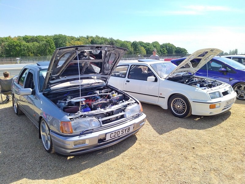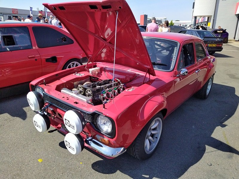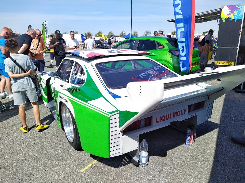 Jízdy pokračovaly během celého dne, takže jsme šli dál po okruhu sledovat, co vše ještě můžeme vidět. Za zmínku stojí určitě stánek hlavního sponzora Mountune. Stály se tam velké fronty v turniketech na prodej dílů - a že to tam chvíli vypadalo, jako kdyby ty věci dávali zadarmo. Za menším hloučkem lidí - závodní verze Ford RS200. Jdeme dále - nacházíme místo se stánky s občerstvením a autokosmetikou. Před ním stojí stará hranatá Fiesta - s motorem YB Cosworth a Turbem T04, přestavěnou na zadní náhon. Majitel patrně šílenec. Asi po další půlhodině procházení mezi zajímavými kousky, které byly různě zatoulané - jako třeba pár Focusů RS MK1, které nestály u hlavního dvojřadu. Co jsme tak pochopili, tak jsou určité zóny, kde jsou určitá auta pospolu a pak ještě zóny, kde jsou kluby. Takže proto se kolikrát objevily auta různě rozházená. Ale bylo to svým způsobem takové pestřejší a vlastně dopředu nikdo nevěděl, co tam bude stát. Po chvíli vidím první Sierru RS Cosworth v bílé barvě a 3dveř s ploutví. Není to RS500, ale první civilní třídveř. Vedle něj Saphire RS Cosworth. Oba kousky přepečlivě umyty a naleštěny. Kousek od těchto krásných kousků procházíme místem, kde byla burza s díly, stánky s různým oblečením, nálepkami, kosmetikou, díly, modely autíček až po občerstvení. Na chvíli odběhnul Mates - ikdyž tam nebylo tak přelidněno jak jsem čekal, během pár vteřin byl pryč. Za chvíli se objevil, drapnul mě a že se asi poseru! - No skoro ano, Ford Capri, ale překopaný dobovým týmem DRM (předchůdci DTM) Zakspeed. Takže na place stál Ford Capri Zakspeed Turbo. Upřímně bych tohle čekal spíše mimo Anglii, ale tohle mě dostalo! Byly dvě varianty motorů - 1,4 Turbo 480koní 9200 ot/min a 1,7 Turbo něco přes 600koní a stejně točící se nesmysl...Přiznám se, že nevím která jednotka v tom byla, ale bylo to šílené, vidět to na vlastní oči a z blízka. Auto z trubek o váze kolem 800kg s takovým výkonem. Masivní bodykit a pod dlouhou kapotou malý brutální mixér, který ve své době neměl konkurenci. Takže zase zpět nohama na zem a jde se dál. O kousek dál nám zase předvedli angličani zlaté ruce a lidovou tvořivost. Focus RS MK2 Cabriolet... To už se po sobě díváme, jestli nemáme úpal, ale tam to asi krom nás 4 nikoho ze židle nezvedalo. Pomalu jsme dostávali hlad, takže jsme se odebrali směrem ke stánku. Po cestě nacházím první Sierru RS500 Cosworth v originál verzi, ale místo T04 bylo turbo Borg Warner. Přicházíme ke stánkům na anglický cheesburger, který byl snad asi nejlepší, jaký jsem kdy jedl, až na uřvanou prodávající, která byla jako papoušek a v okruhu stánků jsme slyšeli jen ji a její " Next please! " . Nicméně sedímena u stolu a díváme se na Mustang Shelby GT500 Eleanor...Po jídle jsme pokračovali v procházce dále. Na jednom place bylo asi 20kousků Fiesty ST200 v šedé barvě. Po cestě vidíme palouk, kde z dálky září oranžová asi 80ks ST Focusů MK2 a MK3, nacházíme Escorty, Mondea, Escorty ve verzi kurýr, Sierru pickup. Mondea ST220....bylo toho tolik, že se to nedalo ani všechno zapamatovat a fotit.