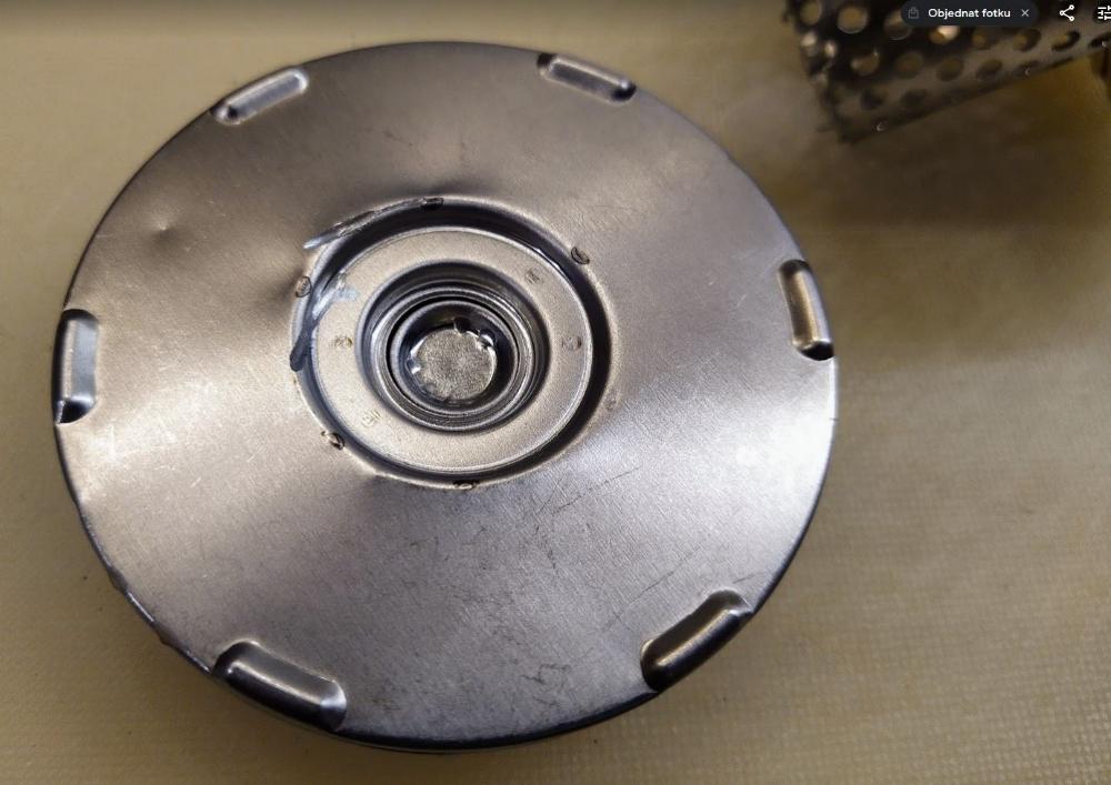 Po rozříznutí filtrační vložky je vidět i obtokový ventil - talířový. Z jedné strany působí pružina, z druhé rozdíl tlaků (tlaková ztráta na filtru) oleje.