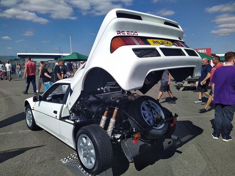 Vzhledem k tomu, že počasí i tento rok opět vyšlo na jedničku, až to skoro vypadá, že to mají v anglii nějak zařízené, slunce pálilo jako blázen a na obloze mraky v nedohlednu, bylo třeba se přesouvat častěji mezi stánky pro něco k pití, ale zaujala nás jiná věc. Na obloze se přímo na Silverstonem po obloze vznášel pravý Supermarine Spitfire. Kdy se tohle podaří vidět a slyšet. Ten zvuk je na živo neskutečný! Několikrát obletěl okruh s rýznými formami stoupání a klesání a pak zmizel nenápadně v dálce. Opravdu dech beroucí zážitek! Při cestě k jednomu stánku s občerstvením, jsme objevili černého Focuse z Nizozemí. Přiznám se, že to vypadalo jako US verze MK1, s předkem z MK2 a zadním nárazníkem z focuse SVT. Vnitřek byl evropské MK1 trochu podobný, ale bylo to kompletně z US verze a z venku nějaký bodykit. Vypadalo to dost zajímavě, ale vzhledem k tomu, že kousek od něj stál netknutý a plně sériový Focus RS MK1 - hold ta evropská krása prostě vyhrává. Jakmile se rozestoupil dav lidí - vidím na palce stát závodní Ford Escort MK3 RS1700 Turbo - u otevřené kapoty jsme se na chvíli zastavili - motor Cosworth BDT - 380koní, v kabině všechno původní z roku 1983 v plné kráse. Ta nostalgie a představa, jak s takovým křehkým autem musí těch 380 koní cvičit, když se turbodmychadlo roztočí vháněla trochu i husí kůži, takže jsme se rozhodli popojít dál k něčemu trošku víc civilnějšímu, ale evidentně jsme vyšlápli ze stříbra do zlata. Před námi stojí další Ford RS200...Pohled na otevřenou zadní laminátovou část, která ukrývala další šílený motor z dílny Cosworthu a hlavně ty trubičky, co tvoří rám celého auta obaleného laminátem - no už na nás šly mdloby...
