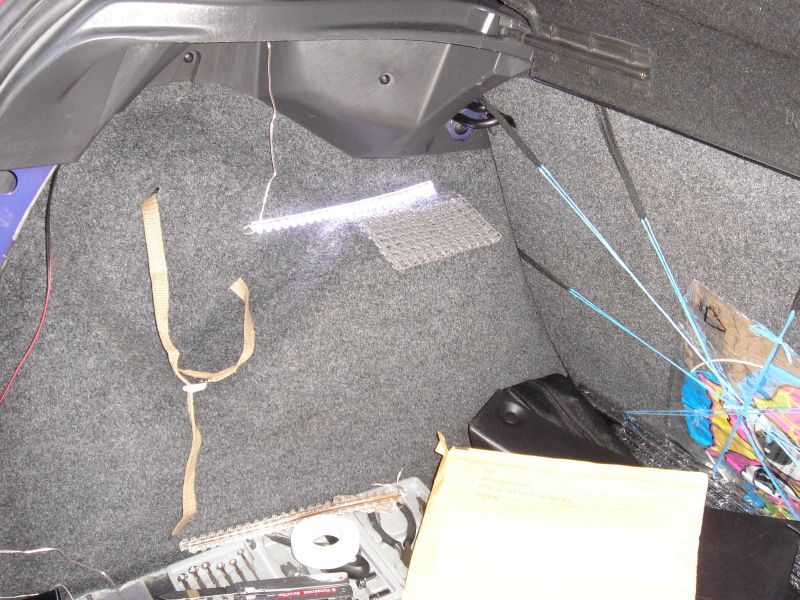 napajanie je ťahané od stropneho svetla v kufri, potom po ľavej strane zadku auta až ku tomu miestu ako vidno z fotiek.. tam kde zaklapne roletka.. vyvrtať dve dierky do tapacíra, prepchať kábliky... naletovať medené pliešky na kábliky a tie pliešky potom obojstrannou paskou nalepiť na tapacirung..