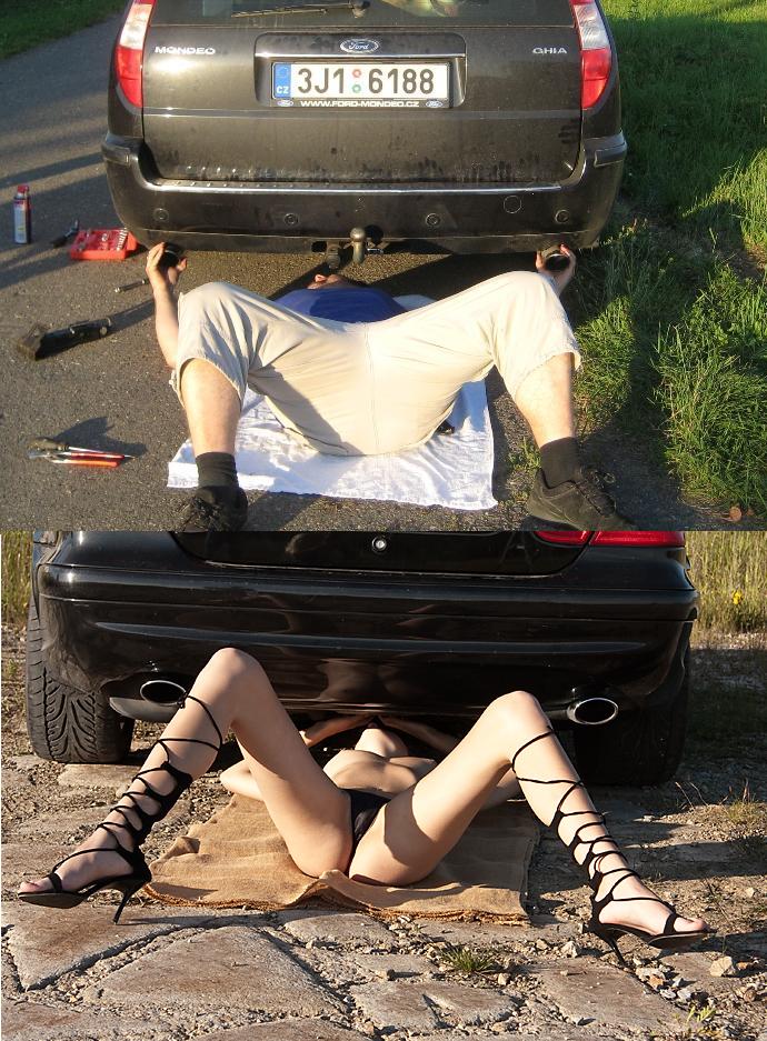 Boban opravující výfuky inspirován jednou nechvalně známou fotkou :-D