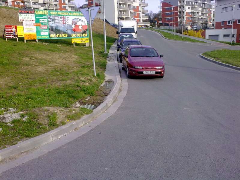 Tady je vidět, že hranice křižovatky je cca 10m od hlavní silnice Takže i ten za mnou je na pokutu. Tady na levé straně jsem viděl 2x stát auto se značkou invalidy a maximálně tam měl lístek ať tam příště neparkuje. Na pravé straně za přechodem jsem neviděl ještě pokutu, ale pokud někdo stál jako druhé auto za přechodem tak jsem pokutu už viděl. A tady je vidět co vůbec nevadí a to i přesto, že kolikrát je tam tak málo místa, že se tam sotva protáhne kočárek