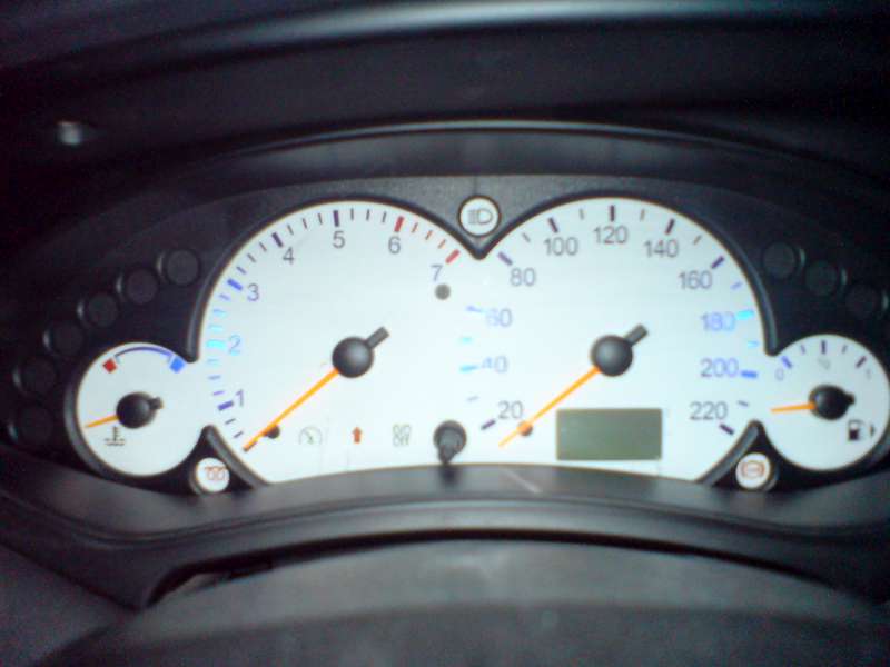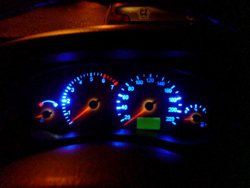 Ja si zvolil variantu dle puvodni a to tedy 200 KM/h 7 ot. Pak sjem si vybral bily podklad a modre podsviceni. Ano celou desku co se tyka budiku(ne kotrolek) podsvetluji tri bíle(proste klasick) zarovicky. Nekdo ma 12V/5W nekvo ma 14V/3W ( podle ceho to je to nevim). Ja mel dve ze tri zarovek praskle a tak jsem zkusil tam misto zarovicek tam dat LED zarovky, nicmene diky charakteristice LED diody vzniklo nerovnomerne podsvicen. Budu jeste resit bud jinou variantou LED zarovky a nebo tam dam ztpet klasickou zarovku.