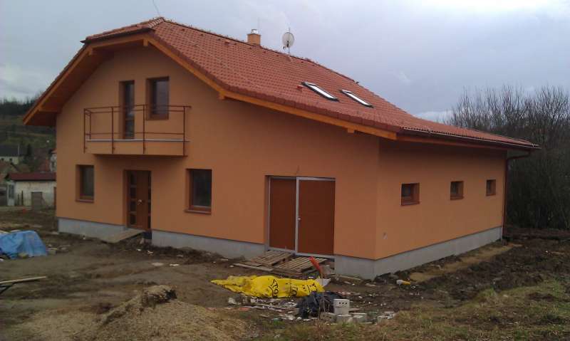 Tak že z venku to vypadá takto,až na pár drobností jako balkony,natáhnout zateplení základovky - to až na jaře je z venku hotovo. Uvnitř rozvody,koupelny,obklady,dlažby,krb,podhledy hotovo,už skoro i penetrace takže vymalovat namontovat schody a ještě pár drobných dodělávek a taky finiš. Pak ještě venku terasa,zámkovka,brána a oplocení a samo úprava pozemku.