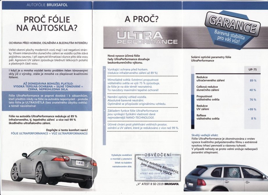 Potvrzuju. Prostup tepla do interiéru je přes tuto fólii výrazně snížený. Stačí si to vyzkoušet tak, že na přímém slunci stáhnete okýnko do půlky a přiložíte zevnitř ruku tak, aby půlka byla na přímém slunci a půlka za sklem s fólií. Rozdíl poznáte sami.Kaizer píše:Jestli chcete na přední skla něco proti infra paprskům tak špička je Bruxsafol řada Ultra Performance.Mám 75 a kdybych neměl přilepenou nálepku s atestem tak se pouhým okem nedá ani poznat, že tam něco je.Účinost je ovšem fenomenální.Má to jednu chybu je totiž drahá.