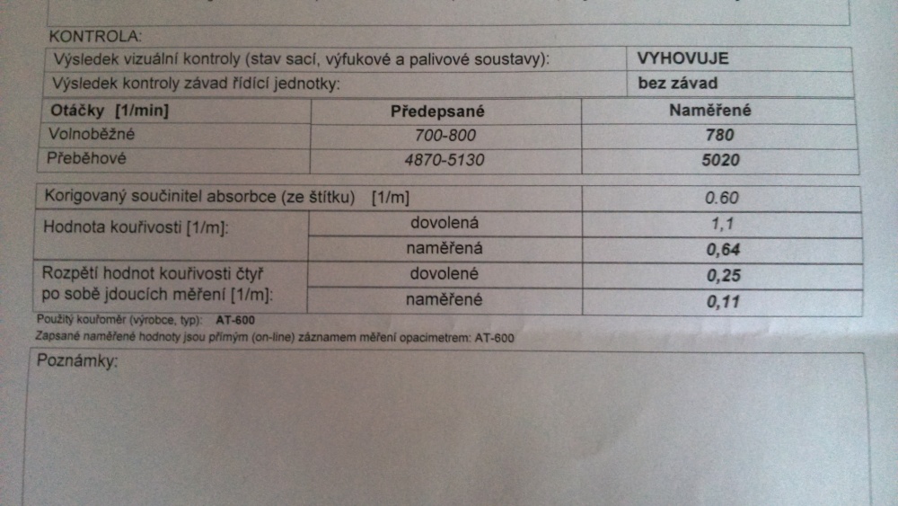 Dnes ráno jsem úspěšně absolvoval STK + ME. Přikládám ofocený protokol s výsledkama. Liška by měl ze mě radost