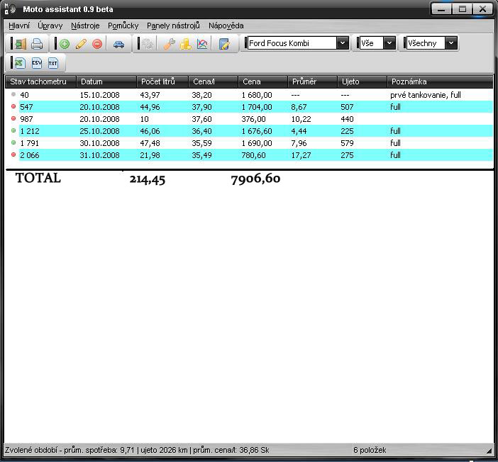 Hele Quickie, když už tě tu mám - padl návrh, aby se údaje za dané tankování (prům. spotřeba a ujetá vzdálenost) nevypisovaly k dalšímu tankování, ale k tomu, ke kterému se to vztahuje - tzn. že by byly tyto dva údaje "posunuty" o řádek výš a u posledního tankování by bylo ono "---".
