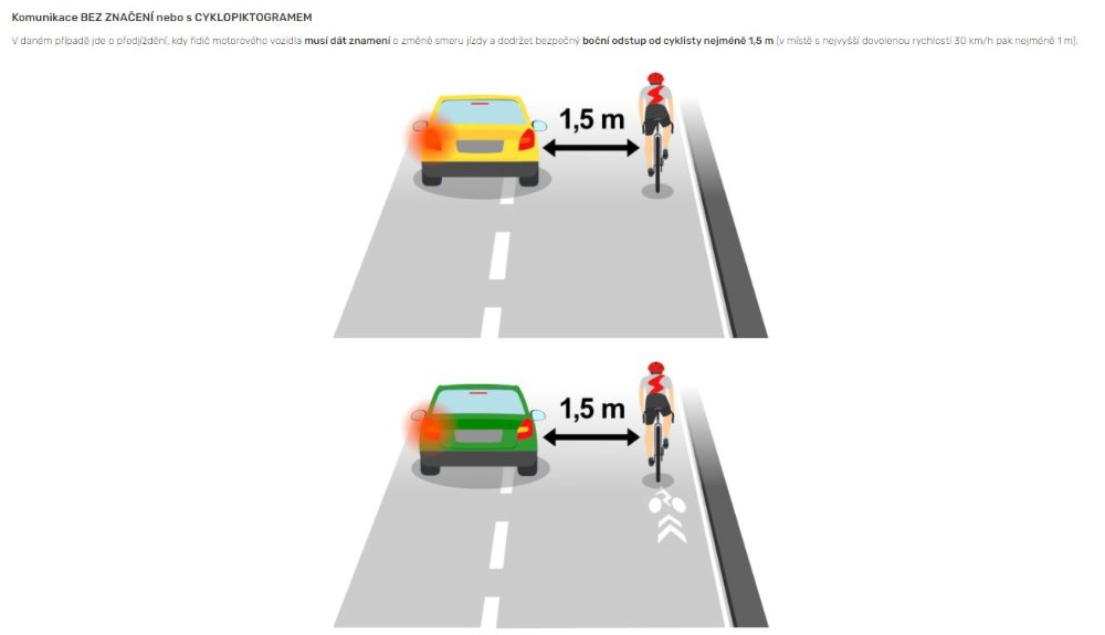 bylo by ale korektni dodat, ze tam, kde je rychlost snizena na 30km/h, tam neplati 1,5m nybrz 1m..a kdyz pripocitam, ze po skoro cele Praze uz maji vyznacene pruhy na silnicich, kde neni zadna minimalni vzdalenost, je to cely takovy vachrlaty..