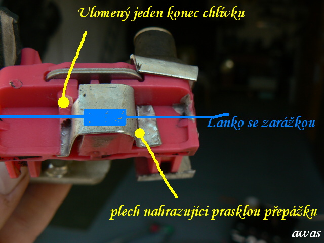 Tu jsem nahradil kouskem umělý hmoty s vyříznutou drážkou prostě tak aby plnil původní funkci,přišroubavaný jedním samořezným vrutíkem.Na druhý straně byly tyto packy obě,ale jedna už naprasklá a bylo by jen otázkou času kdy by umřela taky.Tu jsem vyztužil plechema v místě kde byla hmota prasklá pájkou roztavil-zavařil.Zkoušel jsem na to nakapat roztavenou jinou umělotinu,ale ta nechytala (šedá hmota.)No a taky tam byl prasklý jeden konec chlívečku na zarážku co je na lanku tj.okno by dolů táhlo,ale nahoru by jelo lanko samotný hmotu by netáhlo (každý,kdo se do toho pustí či pustil ví o čem je řeč) no a to jsem taky spravil kouskem plechu.Víc fota.