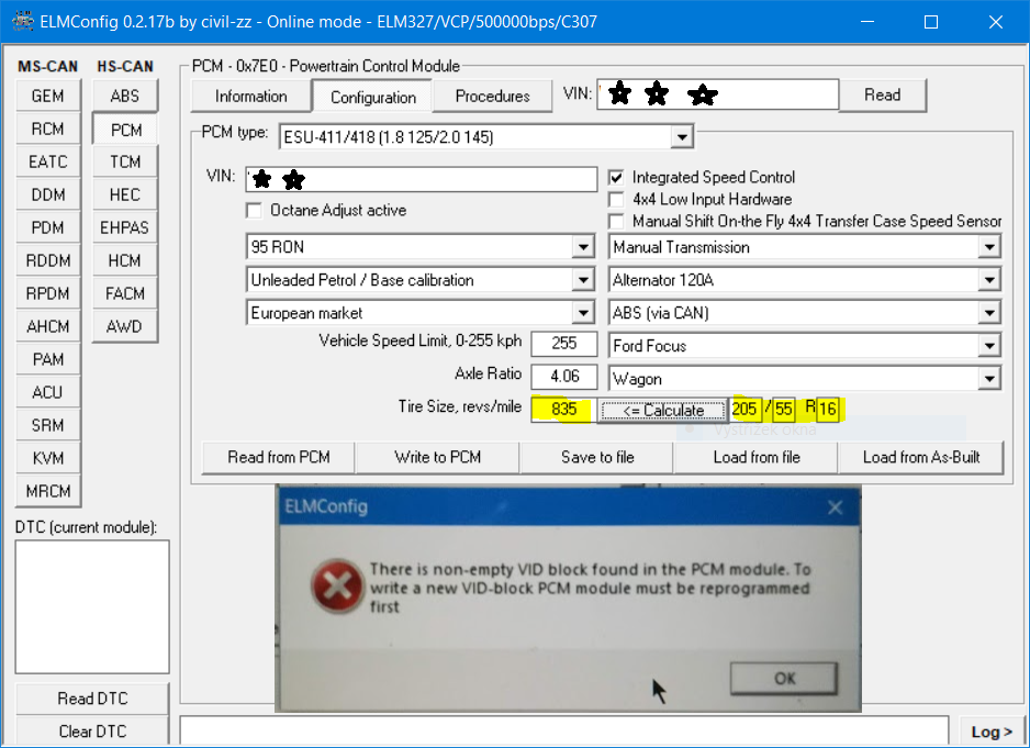Ještě jsem narazil na takovou nehezkou záležitost u PCM modulu (používám ELMConfig 0.2.17b, protože údajně poslední verze ELMConfig 0.2.17c má nějaké problémy). V záložce Configuration jsem si chtěl přenastavit Tire Size, revs/mile (používám stejný rozměr letních i zimních pneu), aby mi lépe odpovídala nastavená rychlost na tempomatu. První jsem dal Read from PCM, které jsem si okamžitě zálohoval (Save to file), ale když jsem změnil hodnotu u revs/mile z 825 na 835 a chtěl jsem to zapsat do PCM (Write to PCM), tak na mě vyskočila chybová hláška "There is non-empty VID block found in the PCM module. To write a new VID-block PCM module must be reprogrammed first" a dál jsem se nedostal. Čemuž popravdě nerozumím. Co jsem pochytil, tak VID-block je v podstatě souhrn nastavení ze záložky Configuration ne? Znamená to tedy, že tam vlastně nemůžu nic nastavit, protože by to muselo jít cestou programování, které ELMConfig v dané formě neumí? Popř. co dělám špatně? VIN jsem načtený měl.