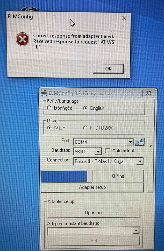 Zdravím klubáci, mám problém rozchodit ELMconfig. Ať jsem zkusil jakýkoliv port, tak mi to prostě nechce vzít. Vyhodí mi to chybu a nehnu se dál (viz screen). Verzi mám 0.2.17c. Přitom Forscan mi funguje normálně. Nevíte prosím někdo, co s tím? Děkuji.