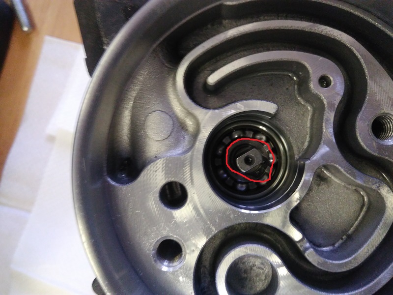 6. Sundáme segerovku včetně podložky pod ní. Tady vidíme ložisko a pod ním je gufero, které však není vidět a slouží k zamezení vniknutí oleje do části, kde je motor.