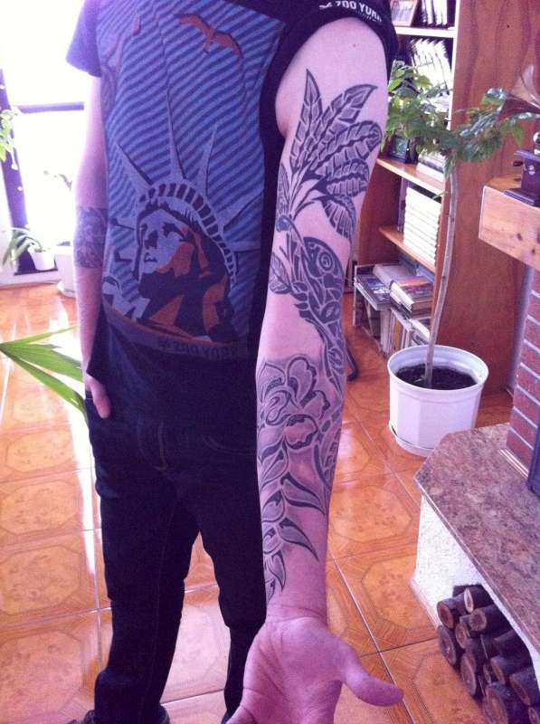 Levá ruka: Prapůvodně to začlo chameleonem... Chamíka proto, jelikož sem je 8 let choval a mám k tomu velký vztah... Po chameleonovi se dělal horní list.... potom se nedělo dlouho nic, ale před měsícem sem se k tomu zase dokopal a dodělával se spodní list a kobylka na vnitřní straně paže. V pátek se dělalo předloktí a stínoval a dobarvoval se zbytek.... a zrovna tohle bylo nejbolestivější tetování, které sem kdy zažil