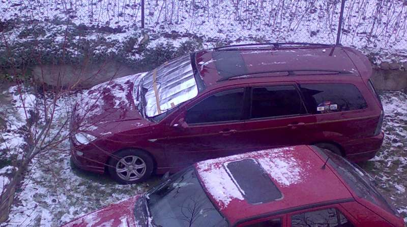 Este to jde "vylepsit". Koupit plachtu (lepsi ci horsi) a zastrihnout ji tak, aby dosahla az k zadnim dverim do kterych ji prave privrit. Odpada pak skrabani ledu ci odstranovani snehu i z bocnich prednich oken (takhle to mam ja). Snih nemusim z auta dolovat, "jen" led uvnitr.