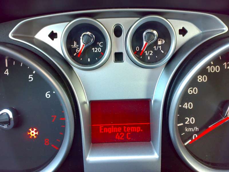 Co se týče ukazatele teploty tak se mi to chová úplně stejně. Nastartuju, ručička je na levém dorazu. Kousek popojedu (řekl bych že je to taky cca 500m) a ručička začne lézt nahoru a po několika sekundách je ručička uprostřed a tam je jako přilepená. Topit to začne až později a podle okamžité spotřeby to taky vypadá, že motor není zahřátý.