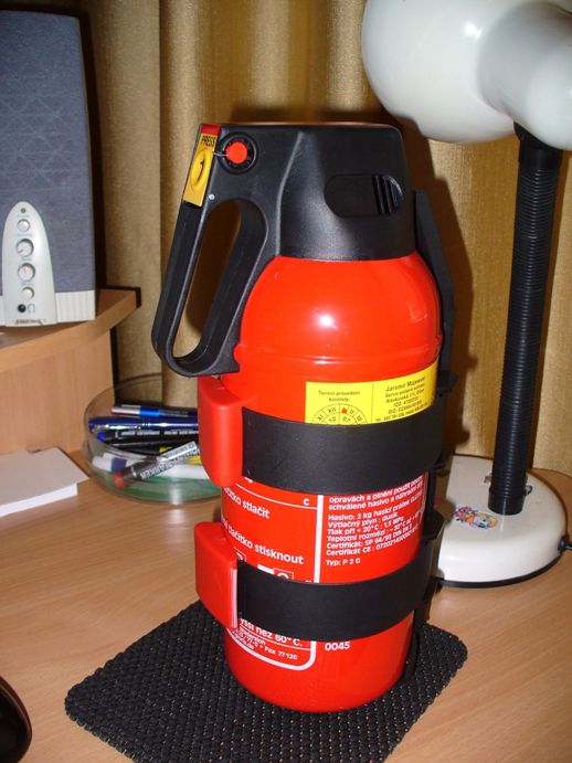 Hmm,myslel jsem leda do zadní kapsy od přední sedačky,ale 2kg hasičák už nebudě žádný tintítko.Já mám obsah 750 ml a zase tak těžký není.Je pod sedačkou spolujezdce.Je obalen suchým zipem a tím přilepen k podlaze.Když luxuji,mám problém ho vyndat.V případě nehody si nemyslím,že by se nějak extra pohyboval.....ťuk ťuk ťuk