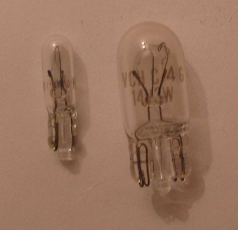 Zarovky na 14V jsem nesehnal, tak jsem dal T10 12V/3W a T5 12W/1,2W. Sviti to krapet vic, ale problemy s teplem ani praskanim nemam. Napr. na auto kelly je najdes pod oznacenim W3W a W1,2W.