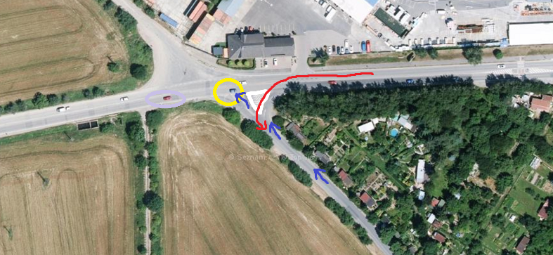 Přijíždím ke křižovatce (modrá šipka), začínám dávat blinkr doleva, protože auta za mnou mohou jet doprava. Najednou mě před autem proletí dement (červená šipka) co si zkracuje křižovatku před protijedoucím autem (žlutý kolečko).