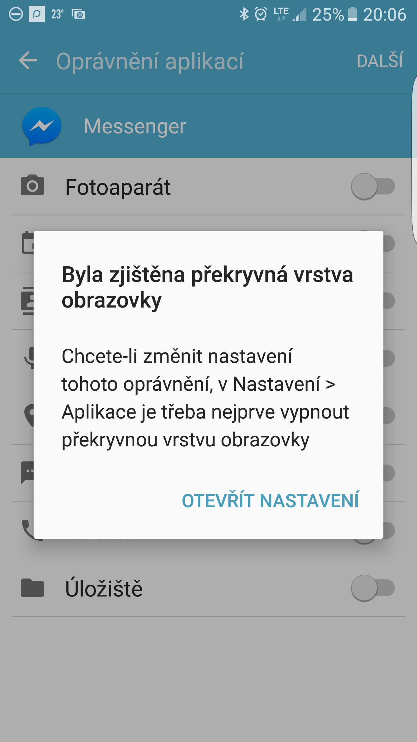 Android 6 si zada povoleni teprve kdyz to aplikace potrebuje. Takze povolit. A druhej screen vyresis tak, ze aplikace, co jsou "navrchu", jako je treba messenger, zavres a pak teprve muzes udelovat ty povoleni. Je to bezpecnostni prvek.