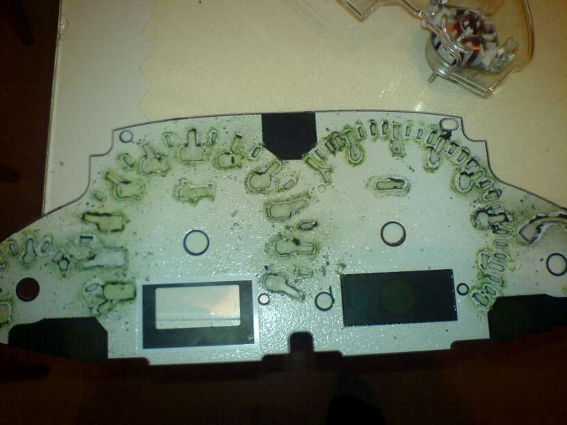 treba vybrat budiky(navod tu niekde je),potom treba dat dole ten priehladny silt(to zvladne aj male dieta-4 zapadky),dalej treba odobrat rucicky(mne pomohla vidlicka).No a teraz je potrebne dat dole foliu foto c.1. odporucam to robit pomali,po kusockoch to odliepat,aby sa to nezlomilo,ide to celkom v poho len rukami.Je dost mozne ze po ztrhnuti folie ostanu na tom plaste kusky farby. foto c.2.POZOR.nepouzivat ziadne chemikalie(ide to zoskrabat prstom),samozrejme ja som pouzil priatelkin odlakovac a ten nejako zreagoval a vytvoril matny povrch(dako to musim vylestit).Na samotnej folii je zospodu zelena farba,ktoru treba odstranit,je to dost makacka lebo na tej zelenej farbe je taky lak a na nom lepidlo.ja som to robil odlakovacom a tycinkami do usi(cca 45min a minusom ich asi 40) foto c.3.je lepsie robit to ciselko po ciselku,palicku po palicke,lebo ked to ocistite cele (vid.predchadzajuce fotky)tak to jemne presvita.treba sa s tim vybavit.Ak to bude presvitat dobra zachrana je centropenka,ale aj ta jemne presvita. ja som si este cervenou centropenkou zafarbil policka na tachometri,ale mam pocit,ze je lepsie pouzit daku cervenu foliu.No a ked to setko mate mozte dat spat foliu a zalozit rucicky.a uz len ostava vymenit zlte ziarovky za ine.napr modre.alebo ledky ako to idem riesit ja.este cakam kym mi dorazia,potom nafotim ako je to riesene,lebo tam nedavam 3 ledky ale 5(vyvrtam duri a priletujem kabliky) Dufam ze dakomu toto pomoze.