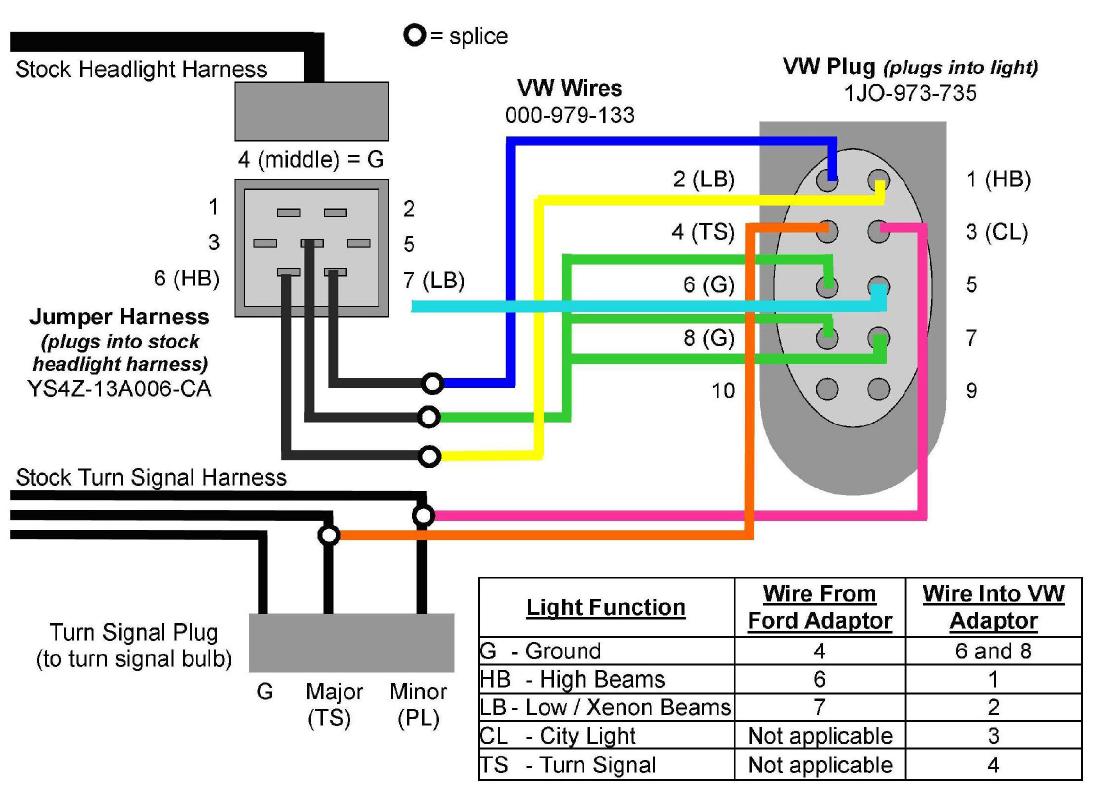 polopate: konektory nalevo jsou pred FL, konektor ten VW je po faceliftu, a je tam ukazane ktery drat kam prijde z konektoru pred FL na konektor po FL.. orientuj se podle cislovani jednotlivych pinu..pred FL to ma dva konektory, jeden do svetla, druhy do blinkru, a logicky se to zapojujuje po FL do jednoho, kdyz jsou v tech svetlech hlavnich integrovany blinkry.. staci takto? podle tohoto schematu to zapojovalo vicero lidi a v pohode..ja mel svetla prepajene behem 60min