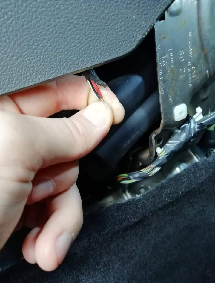 Umístění spíše levá strana (řidiče) na masce ve středu. Na fotce již vidíte polistyren masky před konektorem. Pohled je zpředu zvrchu pod kapotu.