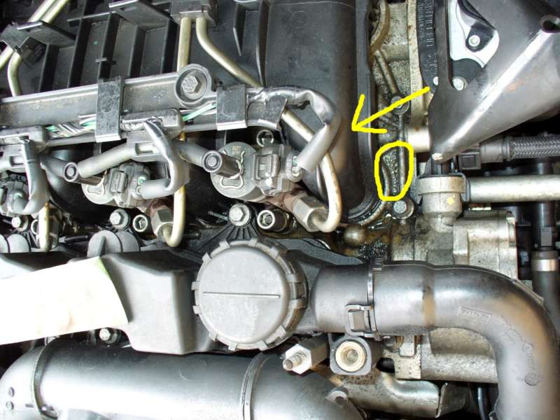 Taky bych poprosil o radu. Objevuje se mi olej na místě vyznačeném žlutě v tom prolisu. Nejspíš se tam dostává z pod plastového krytu označeným šipkou. Čím myslíte že by to mohlo být?? Stačilo by třeba jen vyměnit tesnění u toho kulatého vstupu do hlavy motoru?? Obrázek mám půjčenej, tak se nedivte, že je to tam zasraný od nafty.