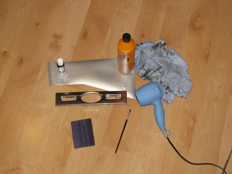 Tohle je k tomu potřeba: Líh+hadr na odmaštění, primer a štěteček na záhyby a hrany, fén na vyhlazení a tvarovou paměť fólie a stěrka na vytlačování bublin...