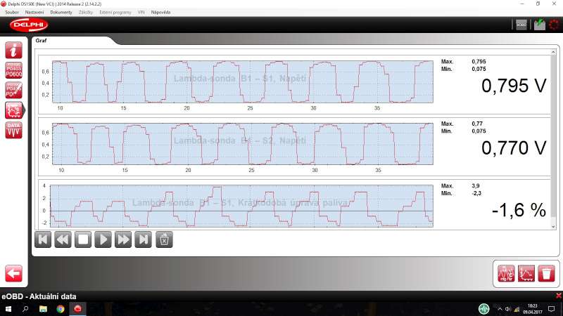 Ta reakce je většinou rychlá podle grafu ale opravdu zadní má někdy divné hodnoty a chtělo by to hodit na pořádnou diagnostiku s osciloskopem . Ta přední má už horší rozsah vypadá ze už je načatá , zadní je asi na tom hůř možná díky tomu katu protože průběh by měl být víc srovnaný při jízdě pod plynem v horní části hodnot.