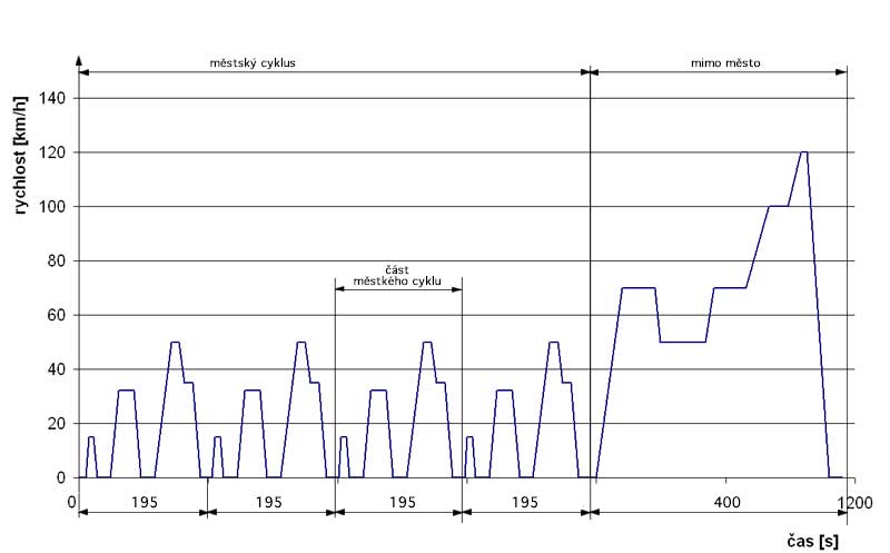 Ještě přihodím ten cyklus. je vidět, že to auto v něm pomalu zrychluje a i stejně pomalu zpomaluje, v podstatě polovinu toho cyklu nežere palivo vůbec. A mimoměstská část má jednu akceleraci asi na 70km/h, která trvá víc než 20s (odhadem z obrázku).