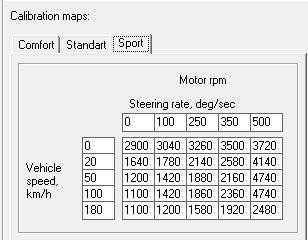 Comfort: Normal: Sport: Auto jsem si přivezl s režimem Comfort a byl jsem krajně znechucen přeposilováním řízení (nejpíš skutečně auto po německém důchodci), ale s režimem Sport jsem vcelku spokojen, ev. bych je (krom hodnoty při nulové rychlosti) max o 10% snížil.