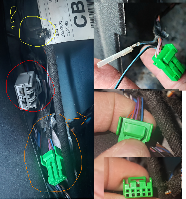 • Identifikova jsem správně to šedě (oranžově označené) jako napájení? Tedy pak nepotřebuji tahat ten konektor z kabeláže na pojistky do levé kapsy.