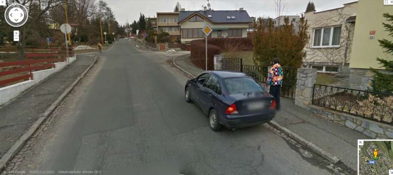 Já měl tu smůlu, že u nás bylo zrovna blokový čištění a to si přeparkuju do sousední ulice, kterou ale fotili v úplně jiný den. Na satelitním snímku mám ale před barákem, tenkrát ještě, obě auta