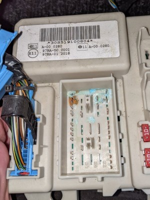 Podařilo se mi nastavit uhnilý pin konektoru. Rozsvítil jsem obrysovky, kontrolku a budíky. Ale potkávačky ani ránu. Nevím, jestli je spíná nějaké relé na tom GEMu, ale určitě tam aktuálně nic "necvakne". Bohužel, jak to jsou dva kusy spájené k sobě, tak je to dost těžko opravitelné.