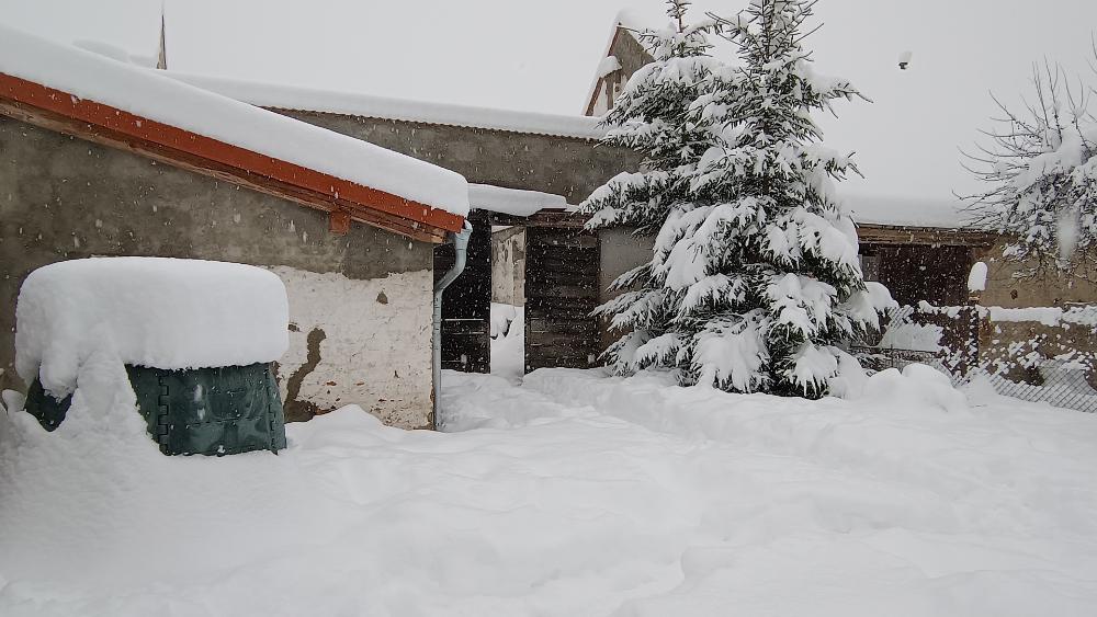 Minulou noc napadl další bílý sníh. Sněžný pluh si zopakoval žertík s příjezdovkou. Nevadí, během chvilky jsem ji proházel.