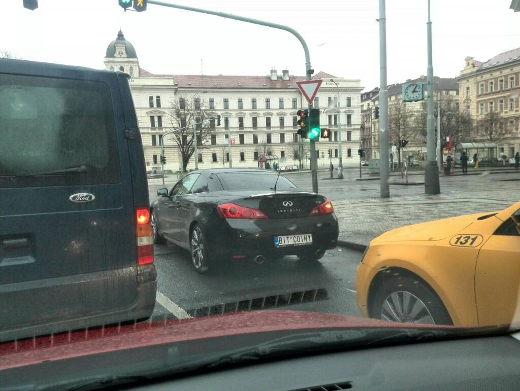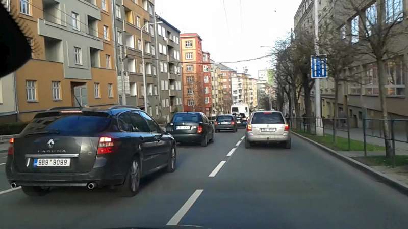 Celkem povedená křižovatka. V protisměru Tesla S s rakouskou značkou W BLITZ2, vpravo na červenou stojí fungl nová sedmička REN OCAR7 a to bávo přede mnou taky nemá úplně obyčejnou značku a o kilomatr dál rencek.