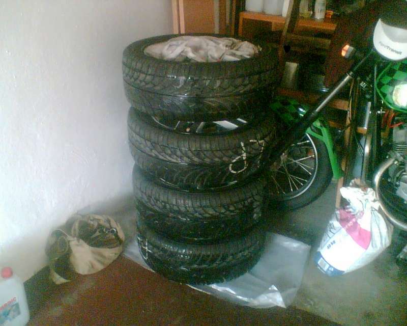 Tak dneska jsem si v obchodě koupil za 328,- stojan na pneu. Docela fajn věcička. Chtěl jsem si ho vyrobit v práci, ale nevyplatilo by se to. Možná jen trošku prodloužím ten základový kříž, jelikož je to s těmi mými elektrony a gumami 205/50 R16 docela vratké. Z pneumatik jsem vyšprtal kamínky, natřel REGUMem, naskládal na stojan a popřál pěkný zimní spánek. A až pořádně vsákne REGUM, tak je přikryji starou dekou.