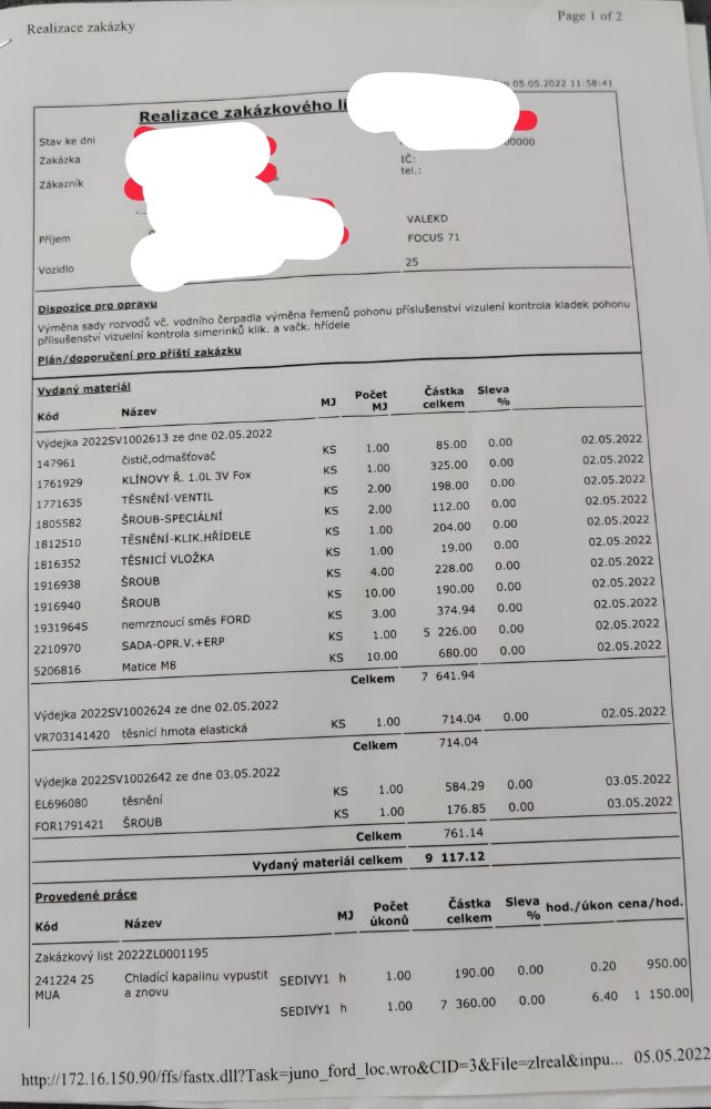 Zajímavé je, že když jsem se v tom servise byl ptát osobně na cenu, technik mi řekl, že tam zrovna jedno litrového ecoboosta dělali, a vytiskl mi zakázkový list. Ročník auta byl 2014 a kilómetrový nájezd bez 100km naprosto stejný jako mé auto.