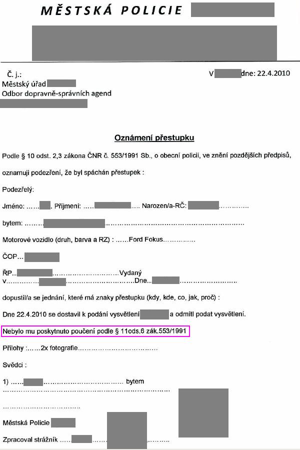 Zbavit se mě nechtěli, fakt jim o ty dvě stovky asi hodně šlo. Když mi začali hrozit, že to pošlou do správního řízení a budu to mít daleko dražší, nadiktoval jsem jim tu větu. Mimochodem, myslíte, jestli jim definitivně přeskočilo a fakt to tam poslali, že na okresním úřadě se z toho protokolu dozví, čeho jsem se to měl vlastně dopustit?