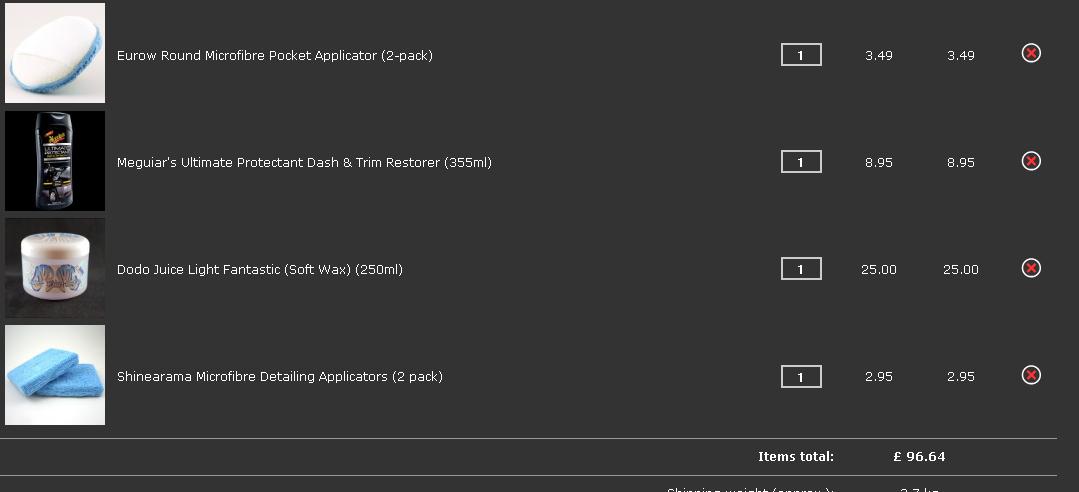 Dotazoval jsem se na 250ml balení Doda vosku a přišla mi odpověd s cenou 1099kč. Na uk webu stojí 25liber,cca 670kč. Red Mist 258kč vs 329kč, AG Leather Cleaner 268kč vs 329kč, AG Leather Care 180kč vs 329kč...a tak bych mohl pokračovat. To dává 1376kč vs 2086kč což je 710kč, je to málo?Miguelicek píše: Shinearama je výborná v tom, že má dopravu z UK jen za 9,00Ł a zboží je do 5ti dnů domaJinak d-o.cz bych moc nepodceňoval, já nebo Marťas odtud věci normálně bereme