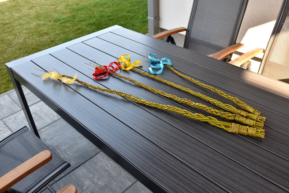 No a po obědě pletení. Pomlázka už má 1/2 práce za sebou, za chvilku vyjedeme za rodičema. Už asi 4 týdny neviděli fyzicky děti, tak teď alespoň na chvíli s rouškama na zahradě. Jen by se ještě na chvilku mohlo zlepšit počasí..