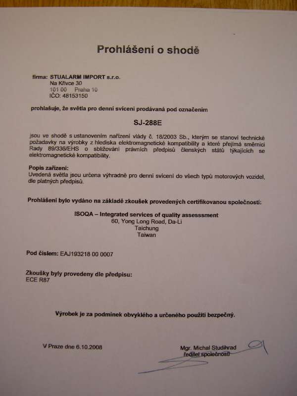 Myslel jsem to všobecně - ne jako útok na něčí světla. Pokud mají DRL všechna označení v pořádu, tak nevidím důvod proč je na auto nedat. Taky nejsu vybobkovanej. Jenom jsem chtěl upozornit na to, že papír snese všechno. V praxi při rozsvícení 10-ti homologovaných DRL světel co mají všechno v pořádku se vsadím, že každý budou svítit jinak silně. Kdybych si já kupoval DRL světla chtěl bych je napřed vidět v akci, nejlíp v porovnání s originálními DRL světly montovaných z výroby, protože chci hlavně aby mě bylo vidět. Na co by mi byly homologovaná DRL světla, která mají vše v pořádku, kdybych nebyl vidět a někdo by to do mě napral, protože mě přehlídnul? Pokud jsou už některá osvědčená a dostanu na ně doporučení od někoho, kdo je už používá, tak je to v pohodě. Vím ze zaměstnání co necháváme certifikovat a co se potom prodává lidem s certifikátem. Nejsou to stejné věci. Pokud jde o světla, tak bych je prostě napřed chtěl vidět svítit.